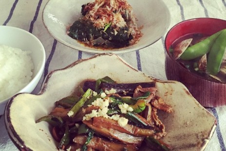 あさりのお味噌汁美味しい〜。 +ナスとピーマンと豚肉の