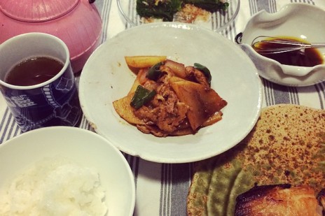 今日の晩御飯。鈴波の粕味醂漬の焼き魚、大根とピーマンと豚肉の甜麺醤炒め、かぶら菜のお浸し、ほうじ茶、ごはん。#life...