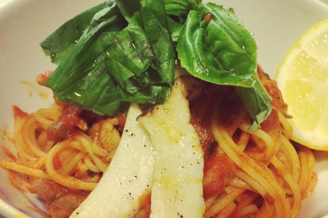 今日のパスタ。エリンギと豚肉のトマトソース。いただきま