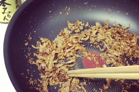 だしを取った後の鰹節でふりかけを作ります。こういう時、菜箸の無い国はどうやってほぐし炒るんだろう。菜箸無いと大変。#life...