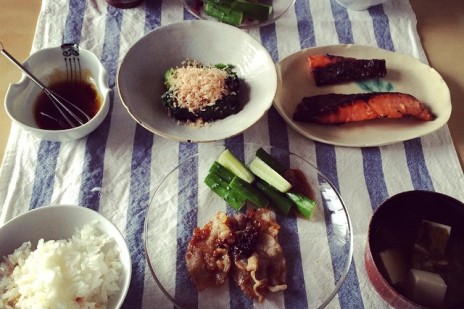 今日のお昼は、豚バラ肉の生姜焼き、きゅうり、鮭の自家製粕漬け、ほうれん草の亜麻仁醤油和え、豆腐と大根菜のお味噌汁、ちょっと焦げちゃったごは...