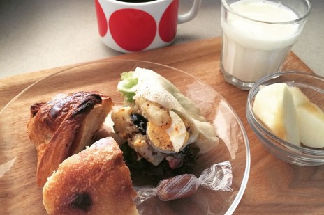 今日のごはんはスーリープーのぱんと王林とヤスダヨーグル
