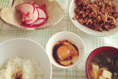 桃かぶの甘黒酢和え、とりおかかそぼろ、豆腐とワカメの味噌汁、ごまたまご、おこげ付きご飯 #life...